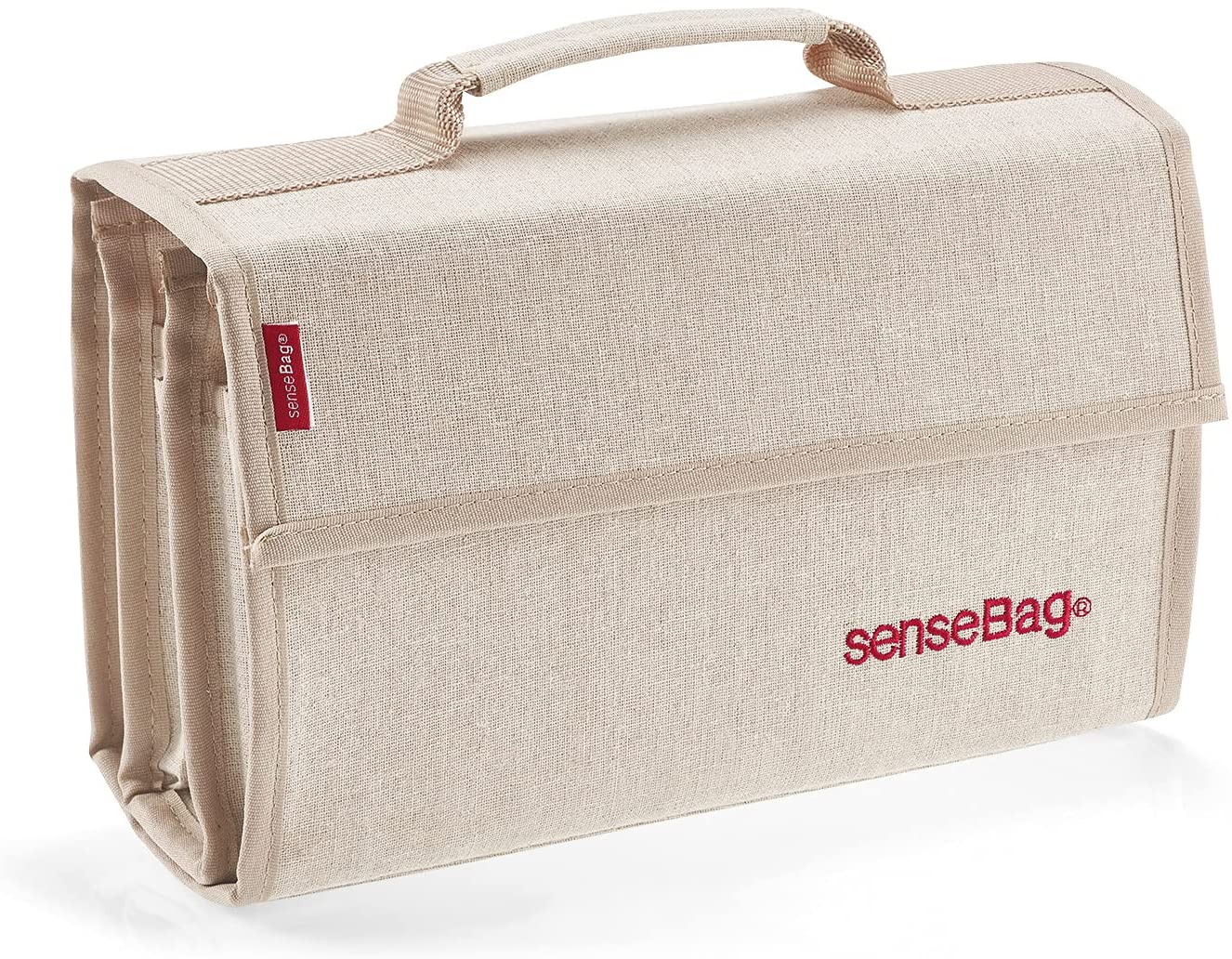 Copic Sensebags are manufactured from a naturally coloured canvas-look high quality polyester fabric and are also washable. With contrasting bright red zips and closures Sensebags are not only practical but also stylish. This handy carry-case is really a two-in-one accessory designed like a book. It will hold up to 72 markers in fabric slots in four compartments. Two of the compartments are removable and are held in place by easily-detachable Velcro for decreasing the bag size great for when you only need some of your equipment. To secure simply fold up and fasten with Velcro. A sturdy carrying strap and zipped pocket on the back completes this very versatile case.