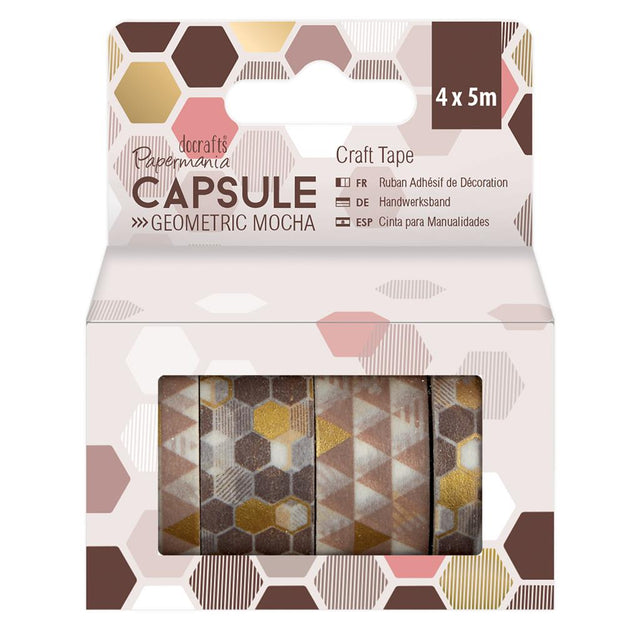 Brand new for 2016 Papermania brings you a striking Capsule Collection filled with contemporary geometric shapes. Combined with this on trend style the warm and earthy tones from the Mocha colourway are a must-have for any craft project this spring. These Craft Tapes add a stunning finishing touch to any crafting project. 4 Designs are included each measuring 5m long.