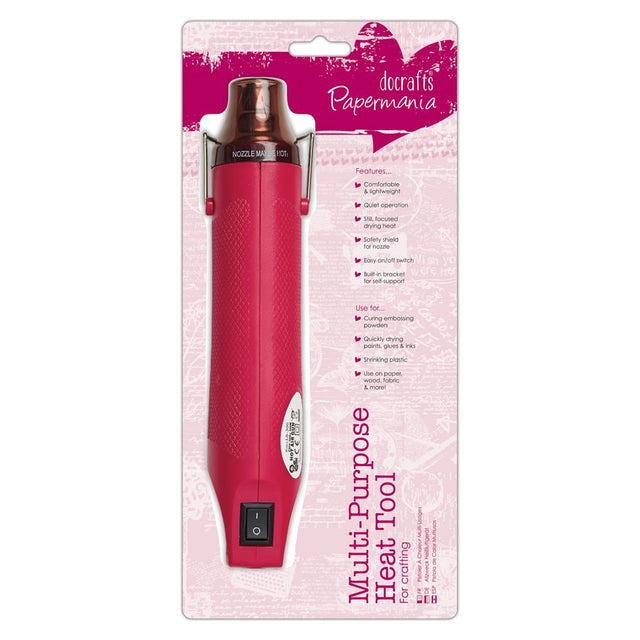 A high quality multi-purpose 2 speed heat tool for curing embossing powders moulding funky foam shrinking plastic as well as quickly drying paints glue and ink. This comfortable and lightweight heat tool is very quiet in operation provides still and focused heat has an easy on/off switch and built in bracket for self-support and comes with a safety shield for the nozzle.