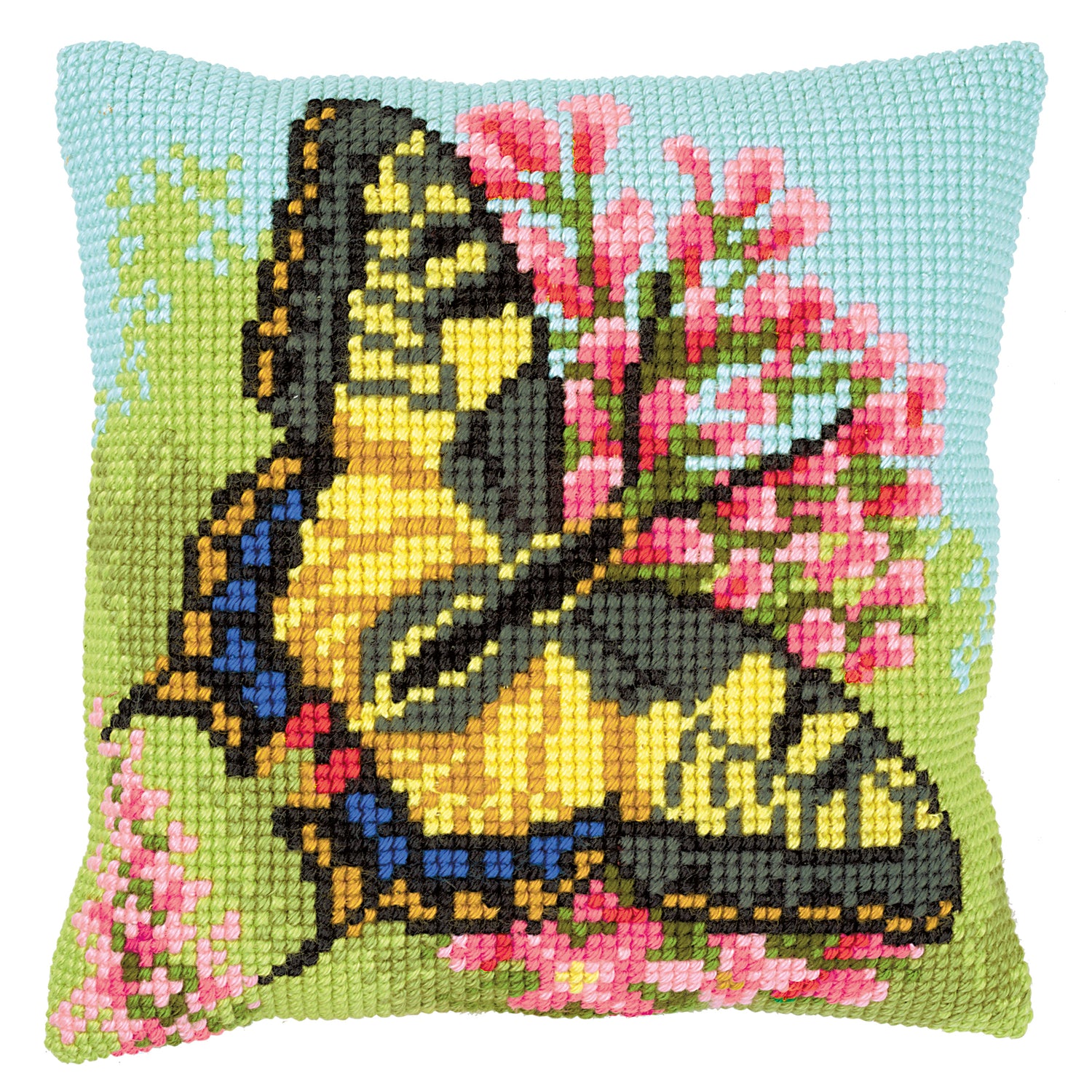 Vervaco Cross Stitch Kit 40cm Cushion Cover - Butterfly & Pink Flowers