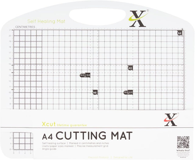 A4 Size (210 x 297mm) Self healing cutting mat. Marked in centimetres and inch. Precise measurement grid with popular paper sizes premarked. Suitable for crafting and much more. Suitable for cutting knives and shape cutters. Comes with an integral carrying handle.